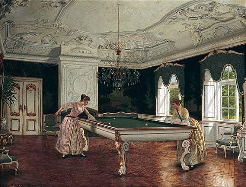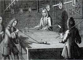 Au XVIIe siècle, les tables évoluent : on ajoute des bandes en bois puis en caoutchouc, ce qui permet aux billes de rebondir et ouvre la voie à un jeu plus technique. C’est aussi à cette époque que la queue remplace peu à peu le maillet, donnant plus de précision aux coups.